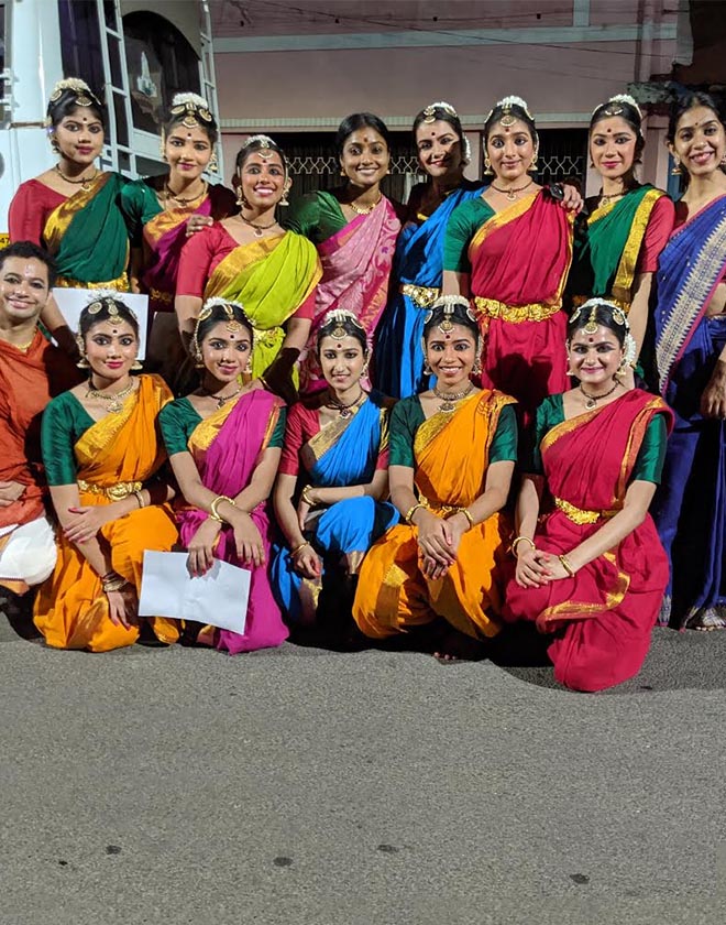 Sāraswatham has worked towards instilling the importance of precision, finesse, clarity of technique and artistic intent in its students through the medium of Bharatanatyam. The seeds of the foundation were sown in 2002 by Renjith Babu. The name Sāraswatham, which stands for ‘knowledge’ or ‘inward journey’, emerged from a moment of serendipity, a moment which also provided a new sense of direction to the foundation. This moment came about when Renjith & Vijna’s spiritual guru, Sri. Ramanacharanatirtha Nochur Venkataraman, an acharya of Vedanta Sampradaya, suggested the name Sāraswatham. Sāraswatham has established a firm footing as one of the premiere dance institutions in Chennai. The foundation conducts regular Bharatanatyam classes and also hosts various workshops, talks and performances on a regular basis. For Renjith & Vijna, Sāraswatham is a humble initiative that hopes to make a difference to the world through the medium of performing arts.